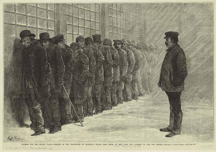Waiting for the second table : Inmates of the Poor-House on Randall’s Island, East River, at New York City, forming in line for dinner | Artist: Joseph Becker | 13 February 1875